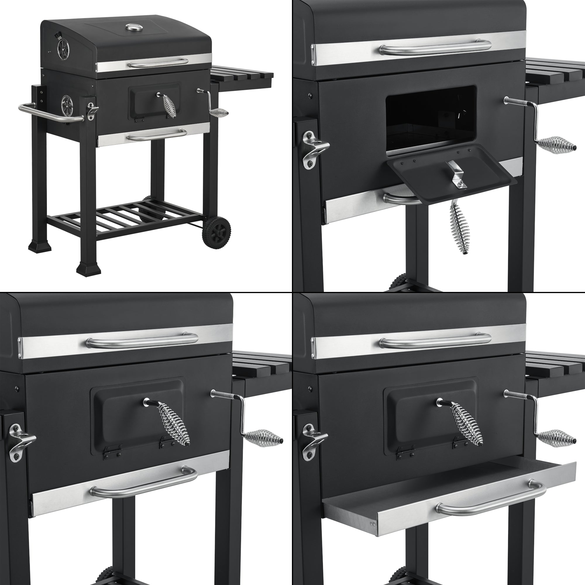 Grillen är också utrustad med en kolbehållare och en låda för uppsamling av aska och olja. Kolbehållarens höjd kan enkelt justeras med hjälp av vevhandtaget. Designen har också en praktisk flasköppnare integrerad på framsidan.