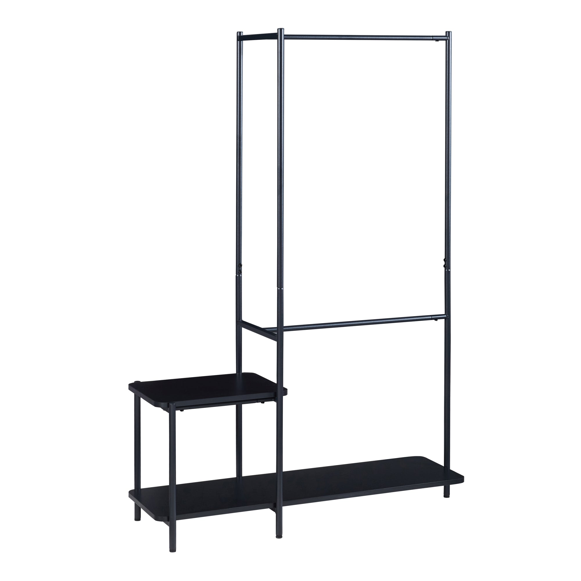 Klädstängerna erbjuder gott om plats för jackor, rockar, halsdukar med mera, medan det nedre hyllplanet är perfekt för förvaring av skor.