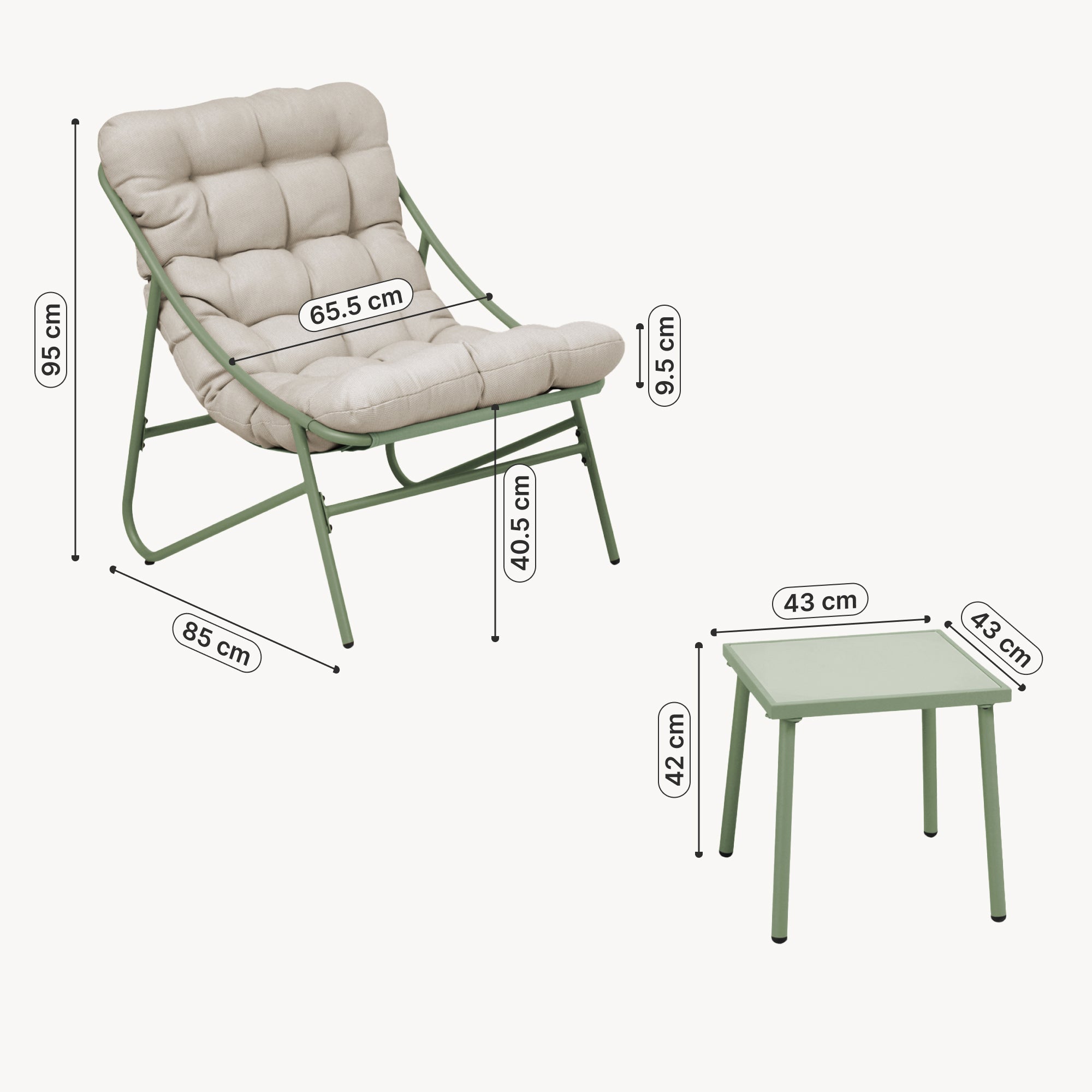 Tack vare de väderbeständiga materialen förblir trädgårdsmöbelsetet hållbart även under olika väderförhållanden. Möblernas robusta stomme säkerställer en säker och stabil stående position.